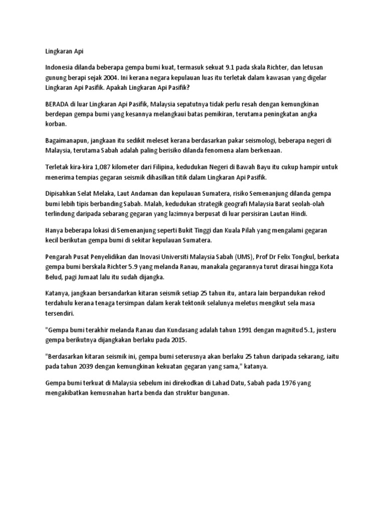 Daerah ini berbentuk seperti tapal kuda dan mencakup wilayah sepanjang 40.000 km. For faster navigation, this iframe is preloading the wikiwand page for lingkaran api pasifik. Salah satu penyebab utama berlakunya gempa bumi berpunca daripada aktiviti pergerakan plat tektonik. Berada di luar lingkaran api pasifik, malaysia sepatutnya tidak perlu resah dengan kemungkinan berdepan gempa bumi yang kesannya melangkaui batas pemikiran, terutama peningkatan angka korban. Cincin api pasifik atau lingkaran api pasifik adalah daerah yang sering mengalami gempa bumi dan letusan gunung berapi yang mengelilingi cekungan samudra pasifik.